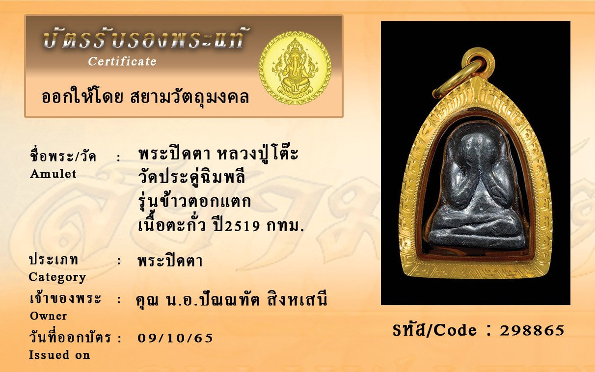 รหัสสินค้า : 298865 พระปิดตา หลวงปู่โต๊ะ วัดประดู่ฉิมพลี รุ่นข้าวตอกแตก เนื้อตะกั่ว ปี2519 กทม.