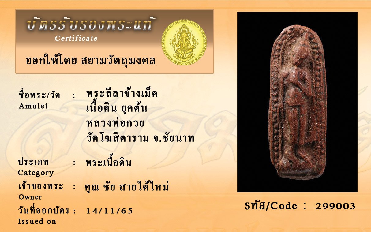รหัสสินค้า : 299003 พระลีลาข้างเม็ด เนื้อดิน ยุคต้น หลวงพ่อกวย วัดโฆสิตาราม จ.ชัยนาท