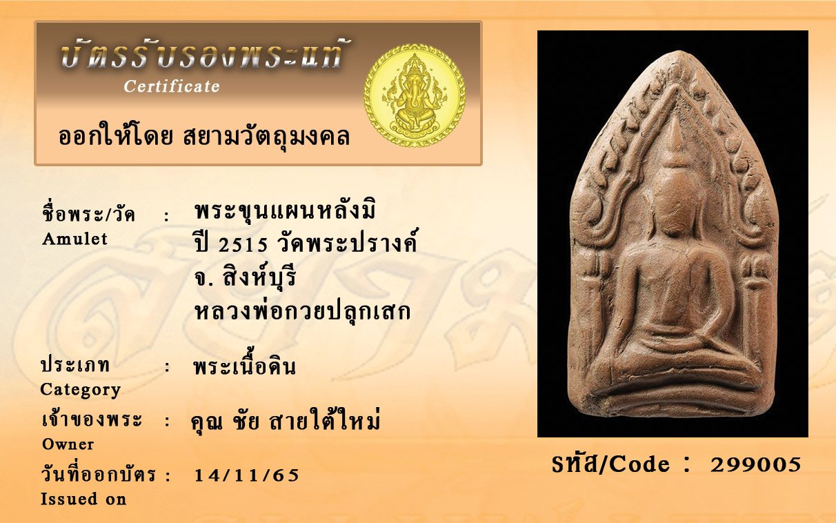 รหัสสินค้า : 299005 พระขุนแผนหลังมิ ปี 2515 วัดพระปรางค์ จ. สิงห์บุรี หลวงพ่อกวยปลุกเสก