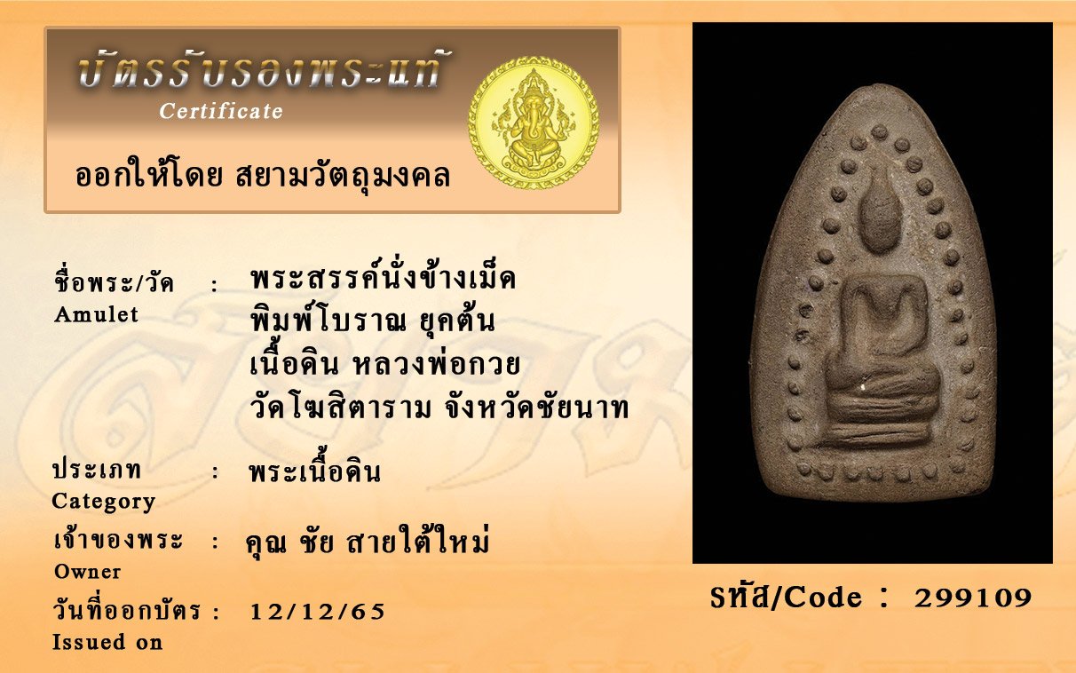 รหัสสินค้า : 299109 พระสรรค์นั่งข้างเม็ด พิมพ์โบราณ ยุคต้น เนื้อดิน หลวงพ่อกวย วัดโฆสิตาราม จังหวัดชัยนาท