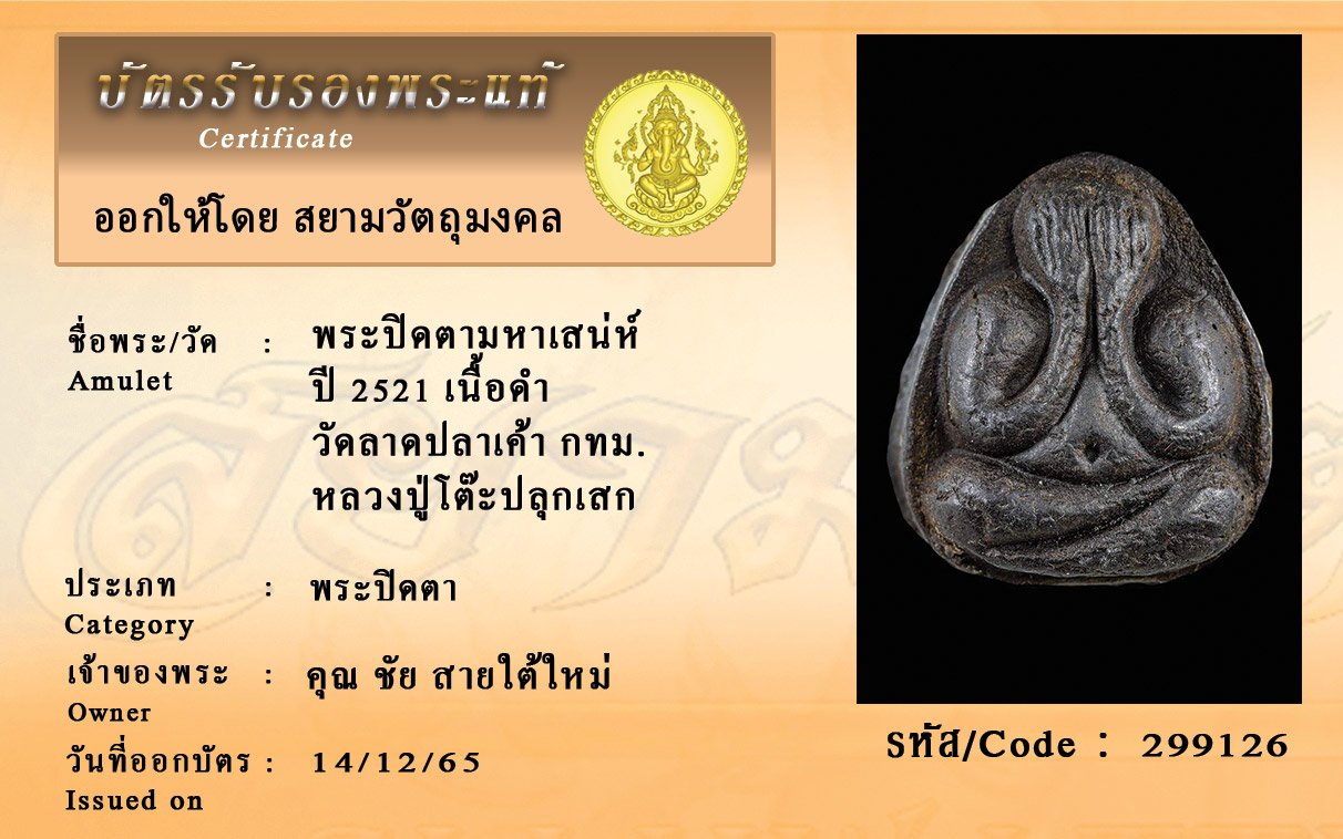 รหัสสินค้า : 299126 พระปิดตามหาเสน่ห์ ปี 2521 เนื้อดำ วัดลาดปลาเค้า กทม. หลวงปู่โต๊ะปลุกเสก