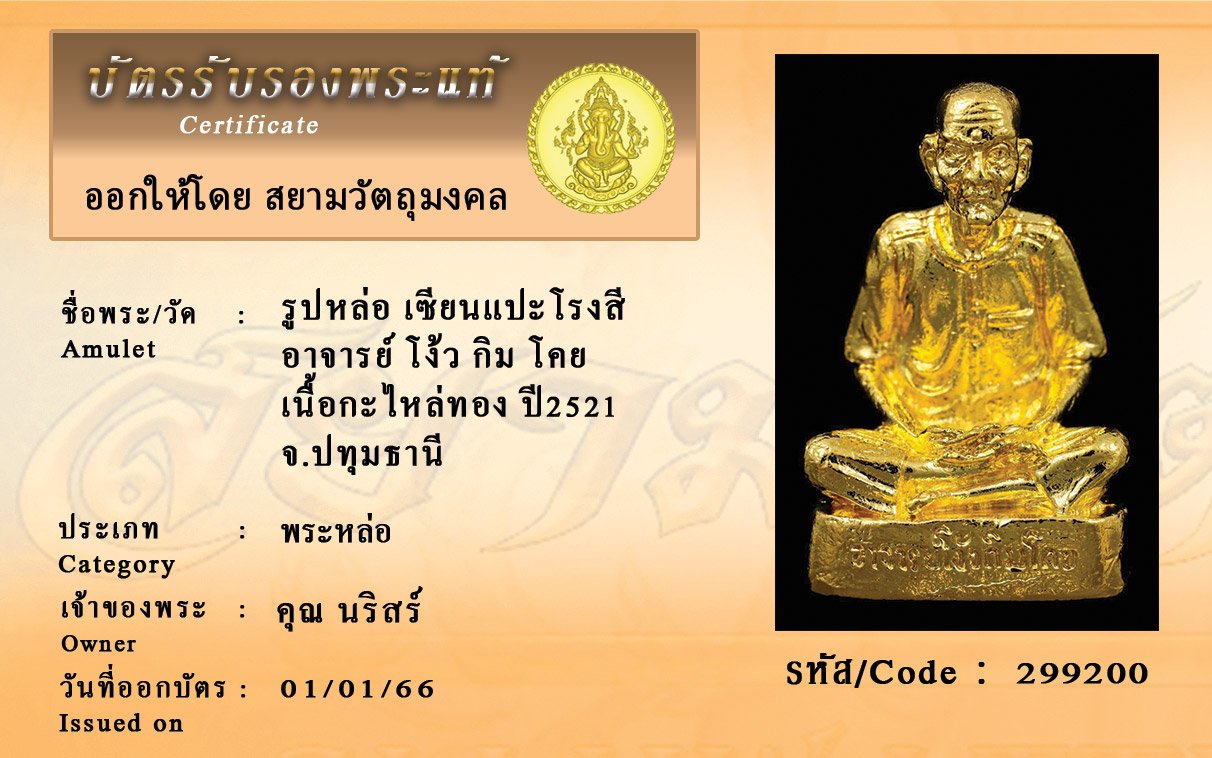 รหัสสินค้า : 299200 รูปหล่อ เซียนแปะโรงสี อาจารย์ โง้ว กิม โคย เนื้อกะไหล่ทอง ปี2521 จ.ปทุมธานี