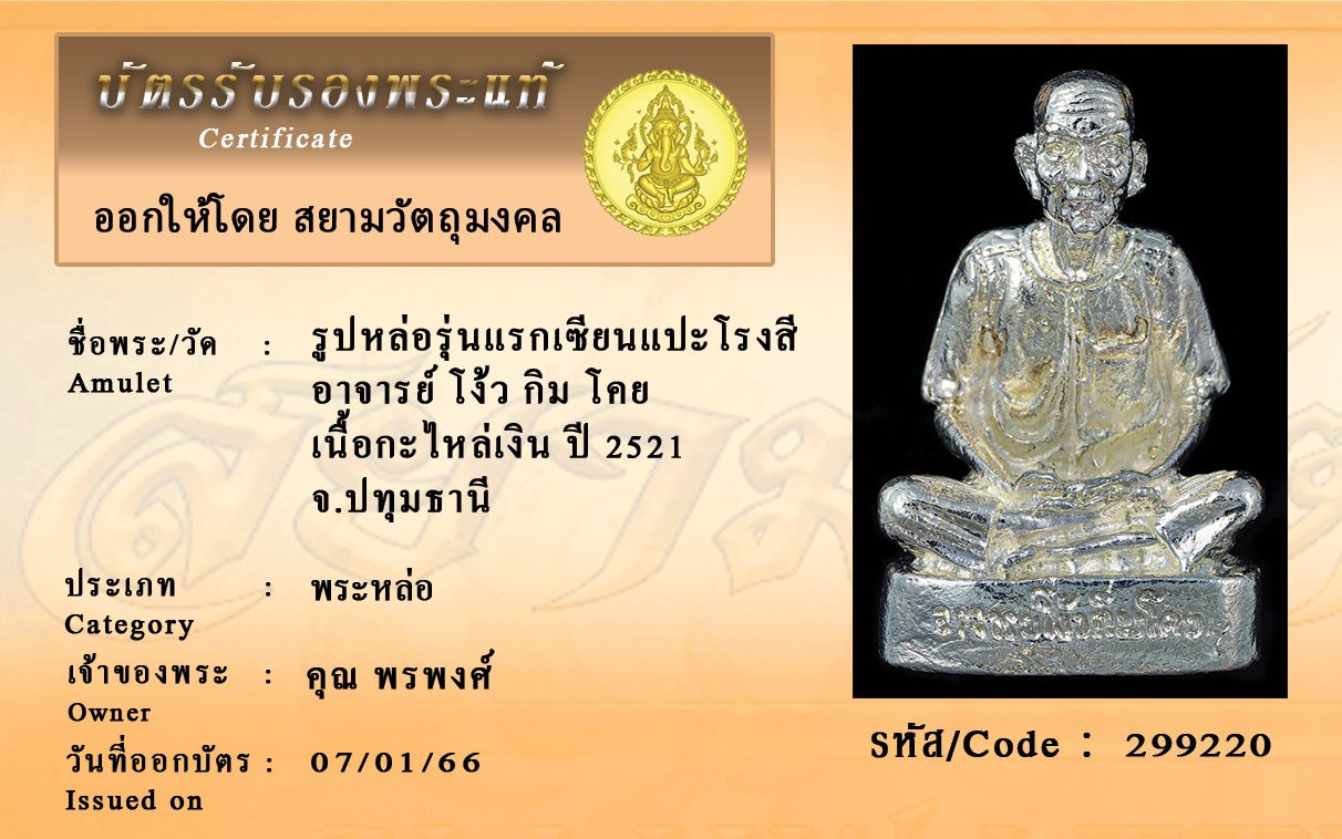 รหัสสินค้า : 299220 รูปหล่อรุ่นแรกเซียนแปะโรงสี อาจารย์ โง้ว กิม โคย เนื้อกะไหล่เงิน ปี 2521 จ.ปทุมธานี