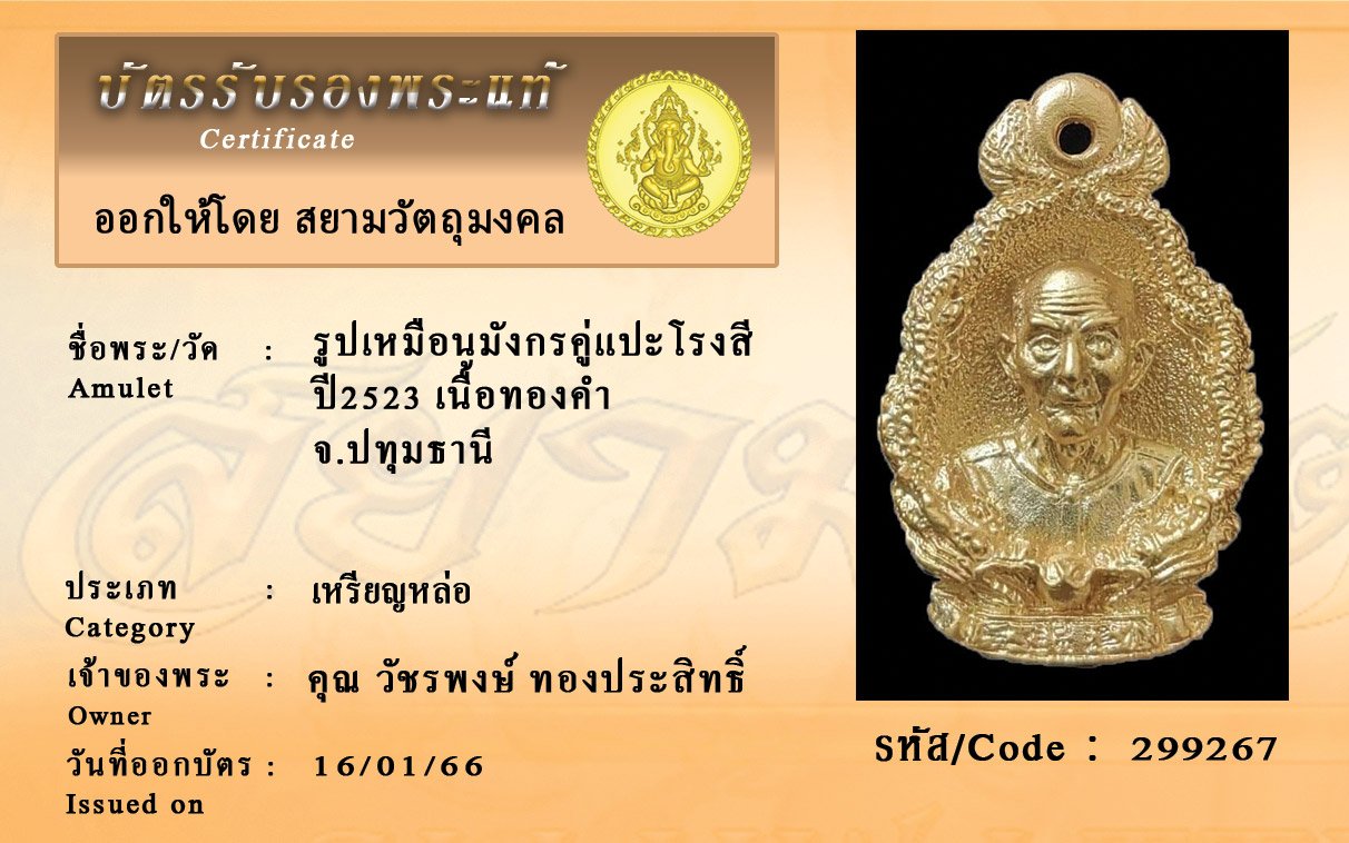 รหัสสินค้า : 299267 รูปเหมือนมังกรคู่แปะโรงสี ปี2523 เนื้อทองคำ จ.ปทุมธานี