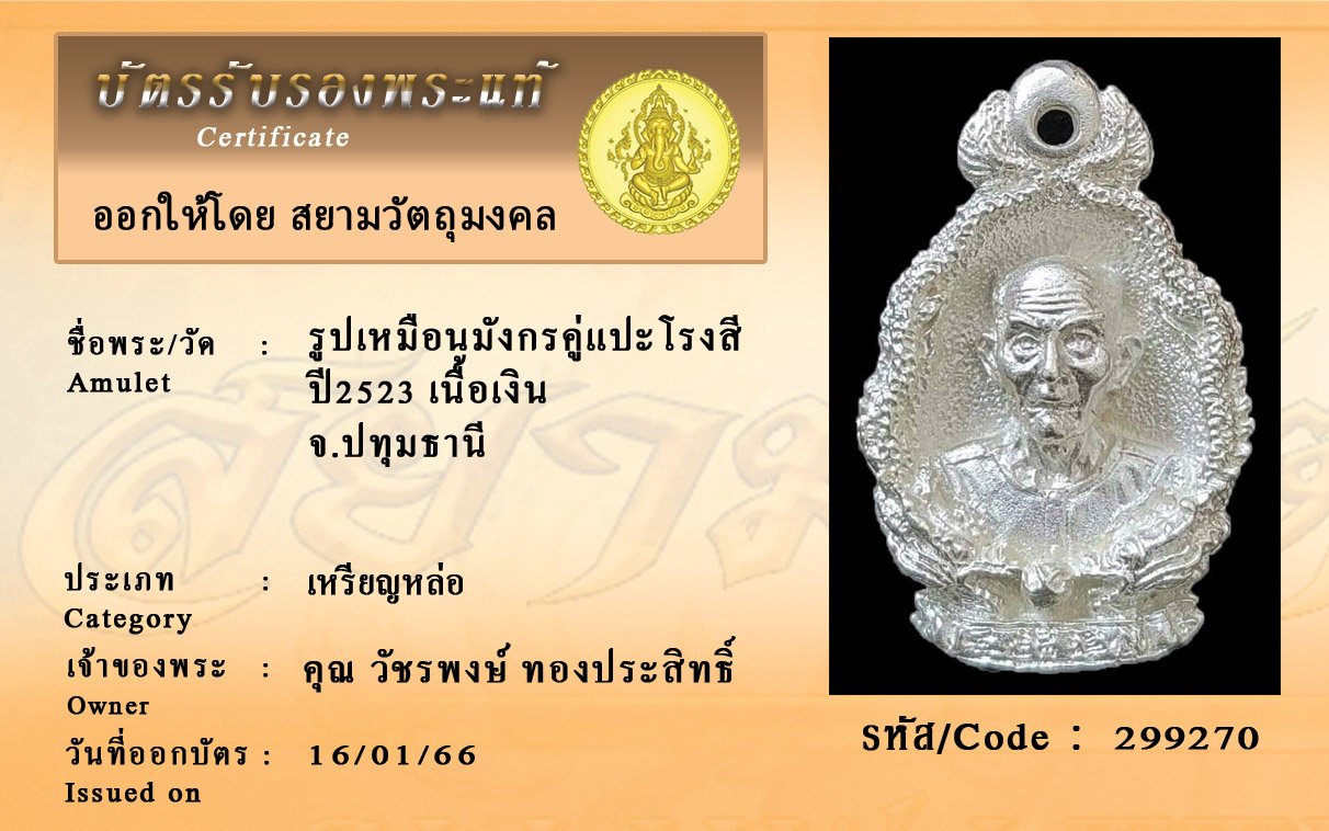 รหัสสินค้า : 299270 รูปเหมือนมังกรคู่แปะโรงสี ปี2523 เนื้อเงิน จ.ปทุมธานี