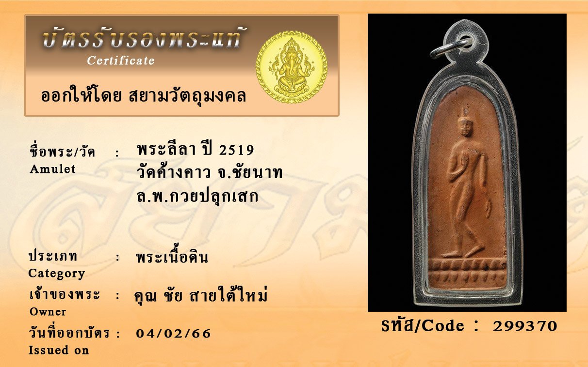 รหัสสินค้า : 299370 พระลีลา ปี 2519 วัดค้างคาว จ.ชัยนาท ล.พ.กวยปลุกเสก
