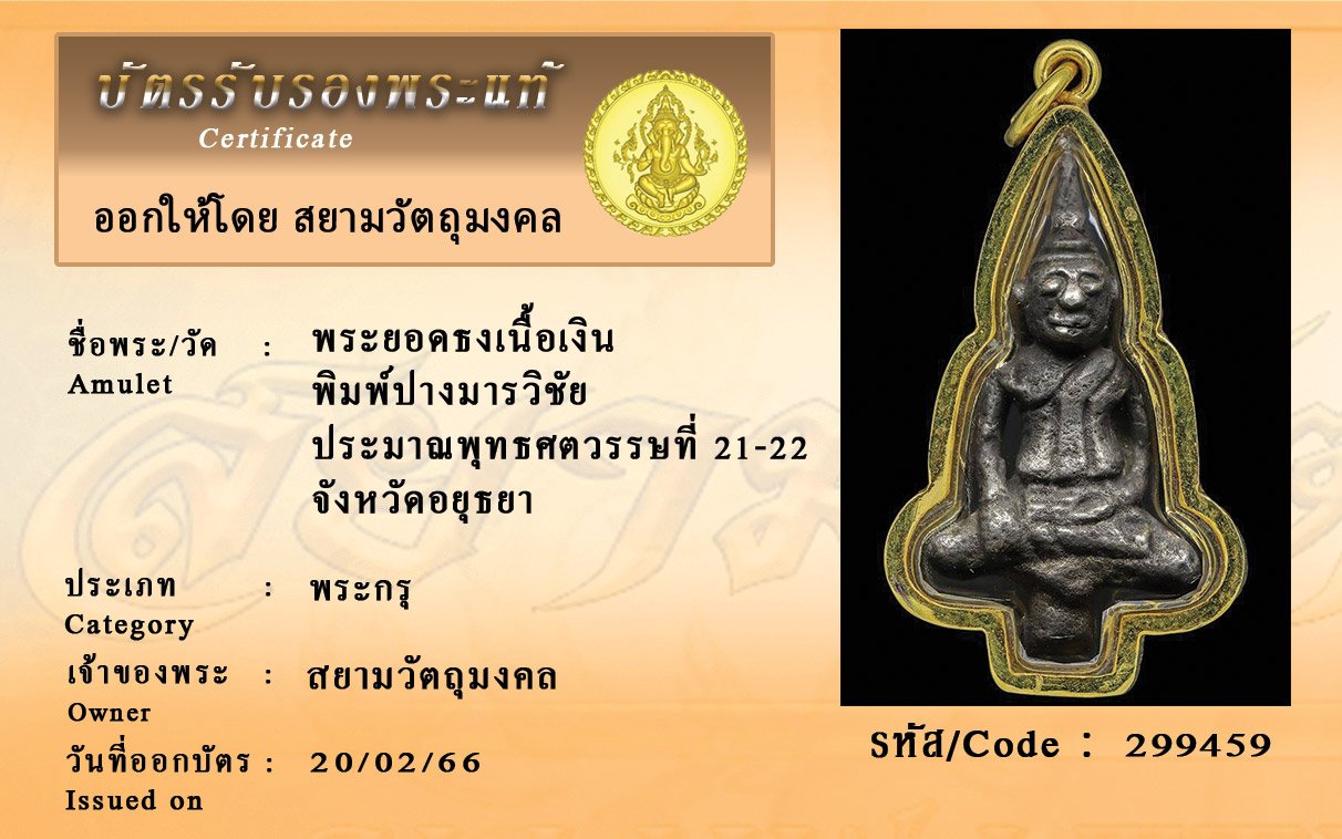รหัสสินค้า : 299459 พระยอดธงเนื้อเงิน พิมพ์ปางมารวิชัย ประมาณพุทธศตวรรษที่ 21-22 จังหวัดอยุธยา