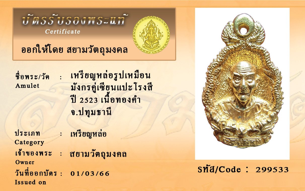 รหัสสินค้า : 299533 เหรียญหล่อรูปเหมือน มังกรคู่เซียนแปะโรงสี ปี 2523 เนื้อทองคำ จ.ปทุมธานี