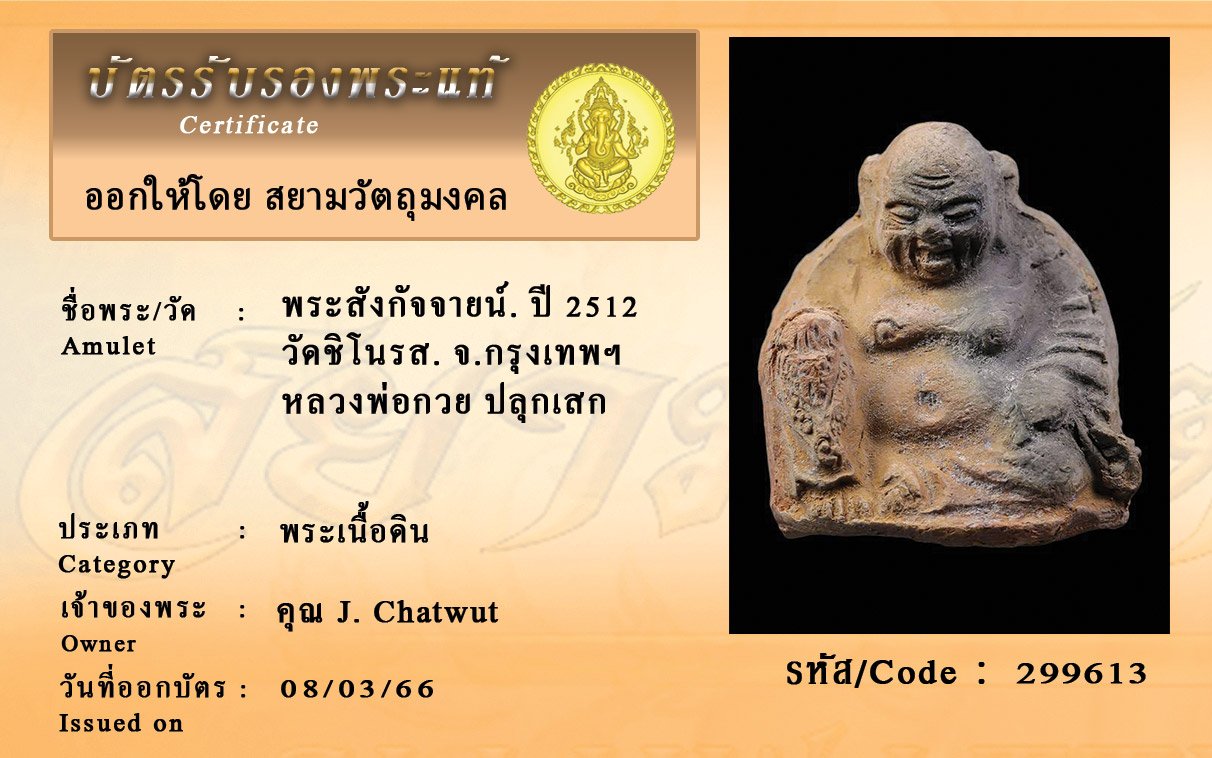 รหัสสินค้า : 299613 พระสังกัจจายน์. ปี 2512 วัดชิโนรส. จ.กรุงเทพฯ หลวงพ่อกวย ปลุกเสก