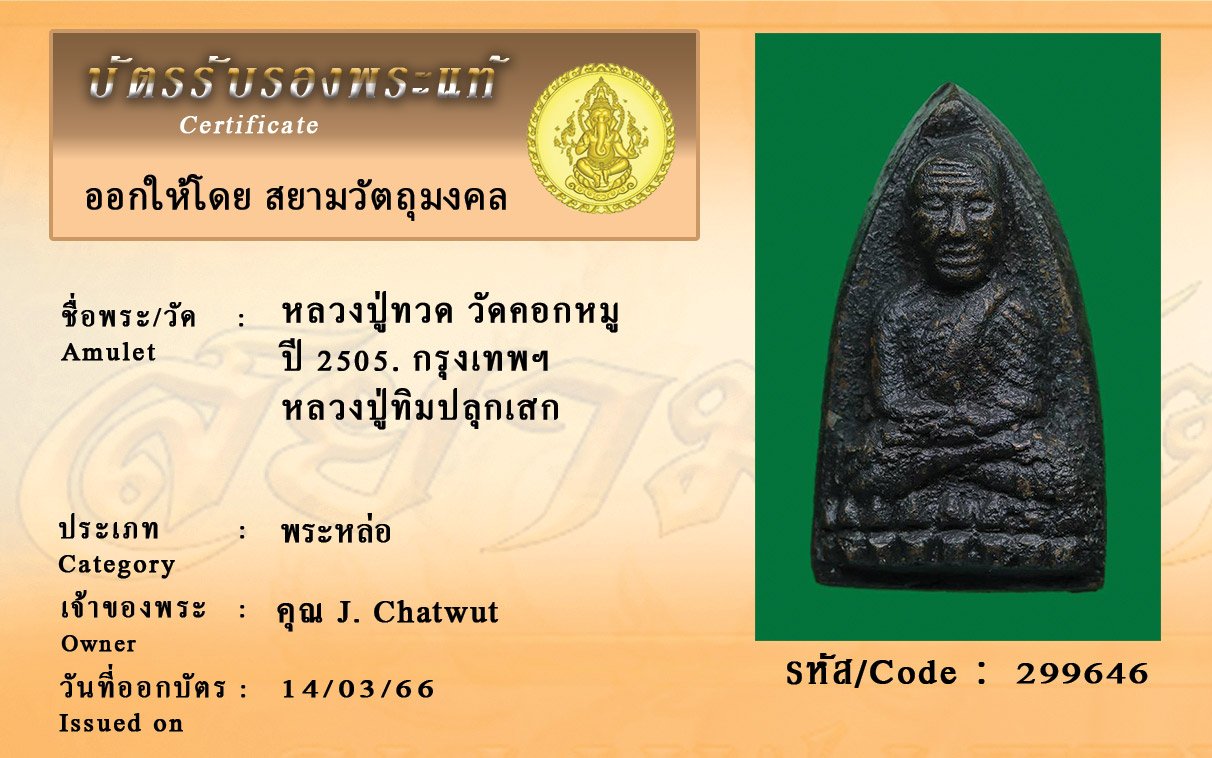 รหัสสินค้า : 299646 หลวงปู่ทวด วัดคอกหมู ปี 2505. กรุงเทพฯ หลวงปู่ทิมปลุกเสก