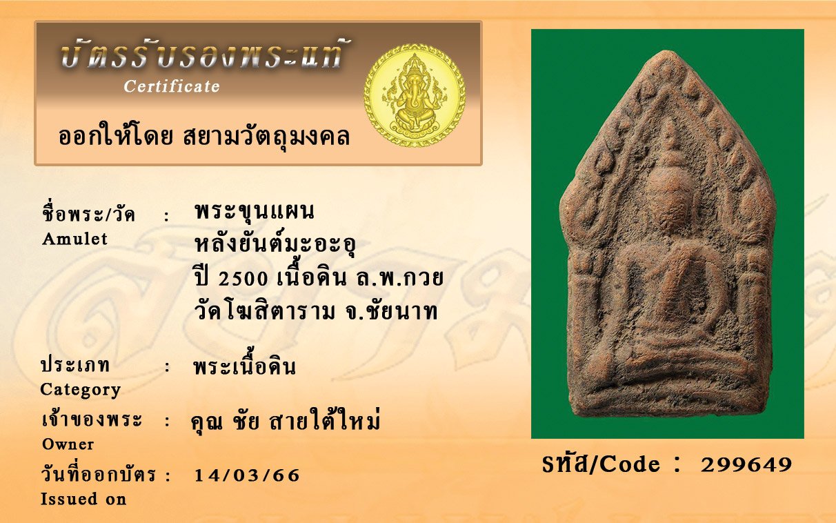รหัสสินค้า : 299649 พระขุนแผน หลังยันต์มะอะอุ ปี 2500 เนื้อดิน ล.พ.กวย วัดโฆสิตาราม จ.ชัยนาท