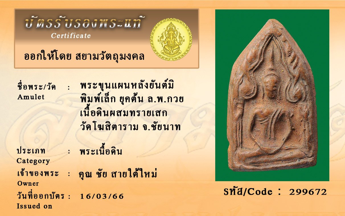 รหัสสินค้า : 299672 พระขุนแผนหลังยันต์มิ พิมพ์เล็ก ยุคต้น ล.พ.กวย เนื้อดินผสมทรายเสก วัดโฆสิตาราม จ.ชัยนาท