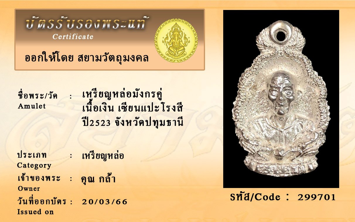 รหัสสินค้า : 299701 เหรียญหล่อมังกรคู่ เนื้อเงิน เซียนแปะโรงสี ปี2523 จังหวัดปทุมธานี