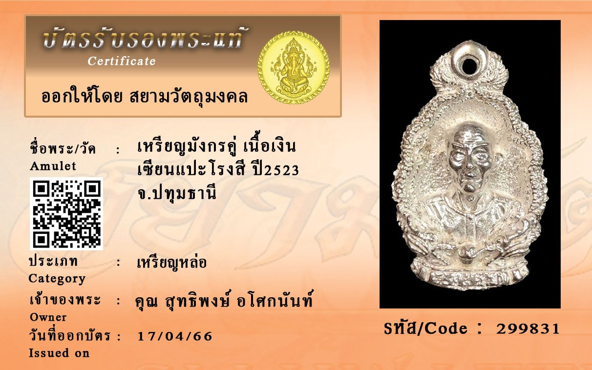 รหัสสินค้า : 299831 เหรียญมังกรคู่ เนื้อเงิน เซียนแปะโรงสี ปี2523 จ.ปทุมธานี