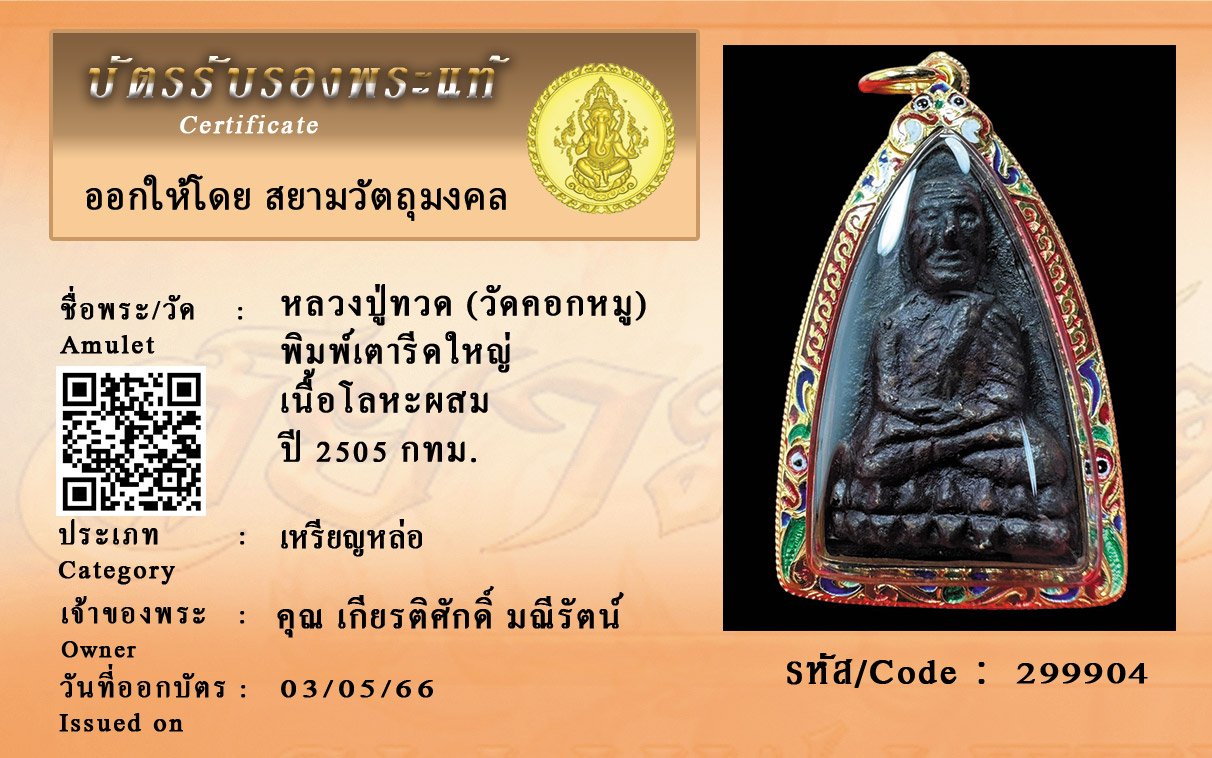 รหัสสินค้า : 299904 หลวงปู่ทวด (วัดคอกหมู) พิมพ์เตารีดใหญ่ เนื้อโลหะผสม ปี 2505 กทม.