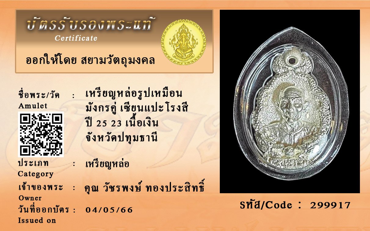 รหัสสินค้า : 299917 เหรียญหล่อรูปเหมือน มังกรคู่ เซียนแปะโรงสี ปี 25 23 เนื้อเงิน จังหวัดปทุมธานี
