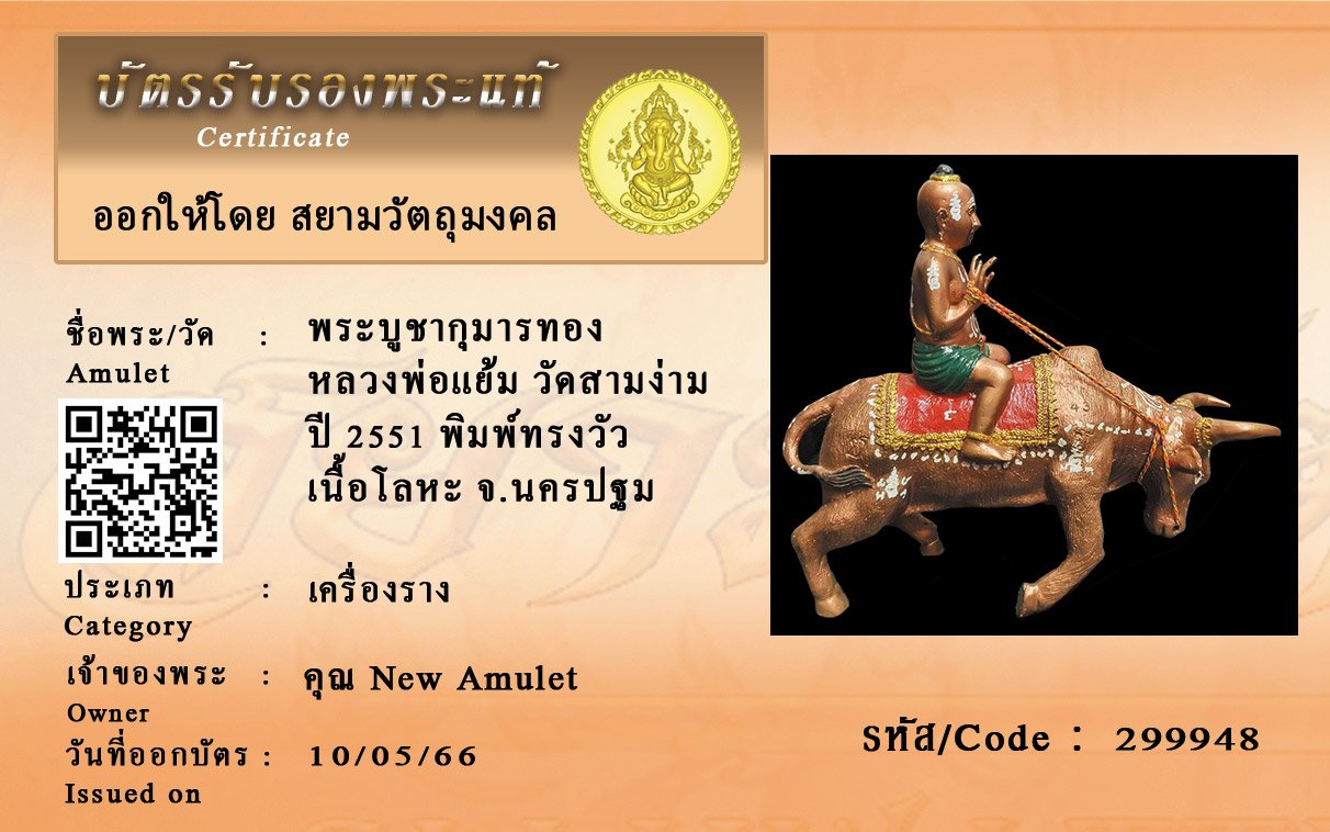 รหัสสินค้า : 299948 พระบูชากุมารทอง หลวงพ่อแย้ม วัดสามง่าม ปี 2551 พิมพ์ทรงวัว เนื้อโลหะ จ.นครปฐม