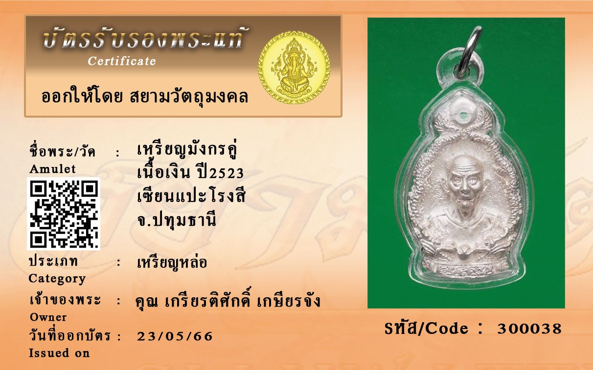 รหัสสินค้า : 300038 เหรียญมังกรคู่ เนื้อเงิน เซียนแปะโรงสี ปี2523 จ.ปทุมธานี