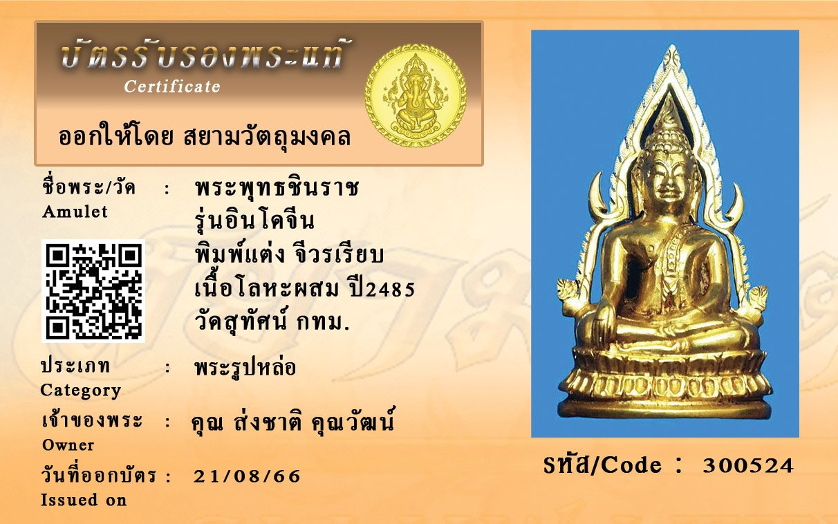 รหัสสินค้า : 300524 พระพุทธชินราช รุ่นอินโดจีน พิมพ์แต่ง จีวรเรียบ เนื้อโลหะผสม ปี2485 วัดสุทัศน์ กทม.