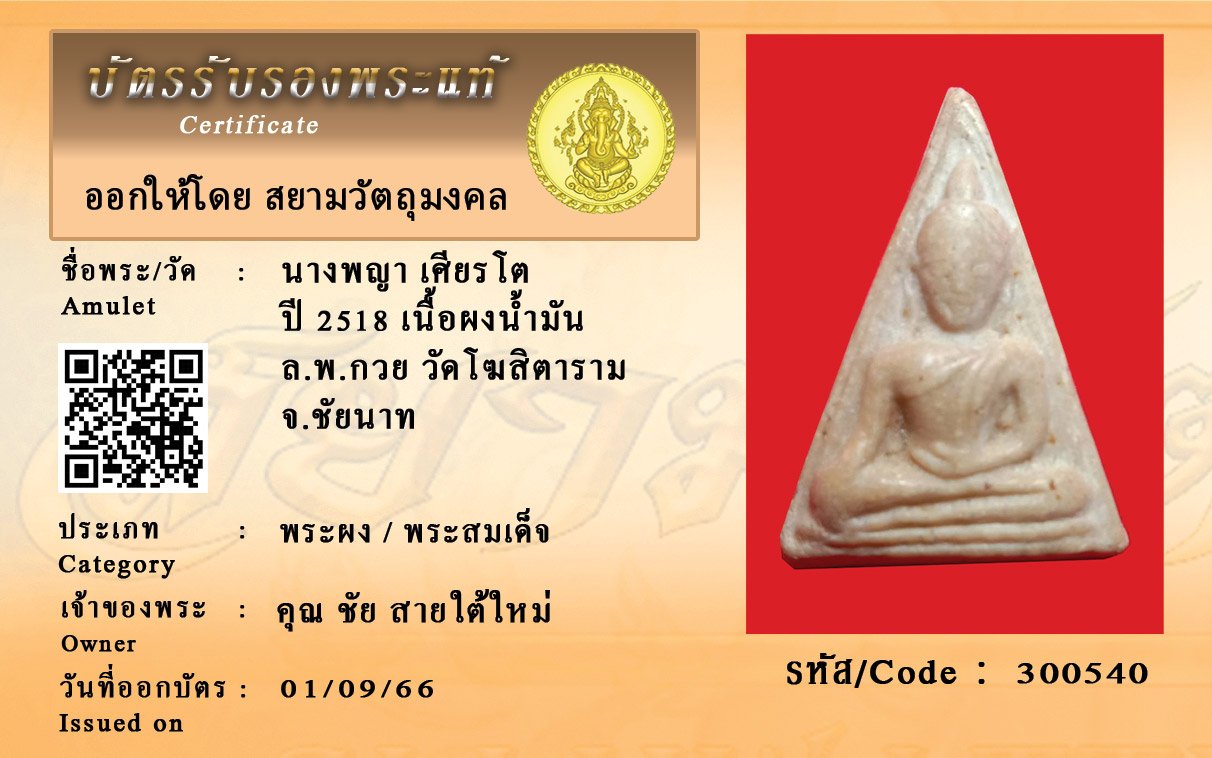 รหัสสินค้า : 300540 นางพญา เศียรโต ปี 2518 เนื้อผงน้ำมัน ล.พ.กวย วัดโฆสิตาราม จ.ชัยนาท