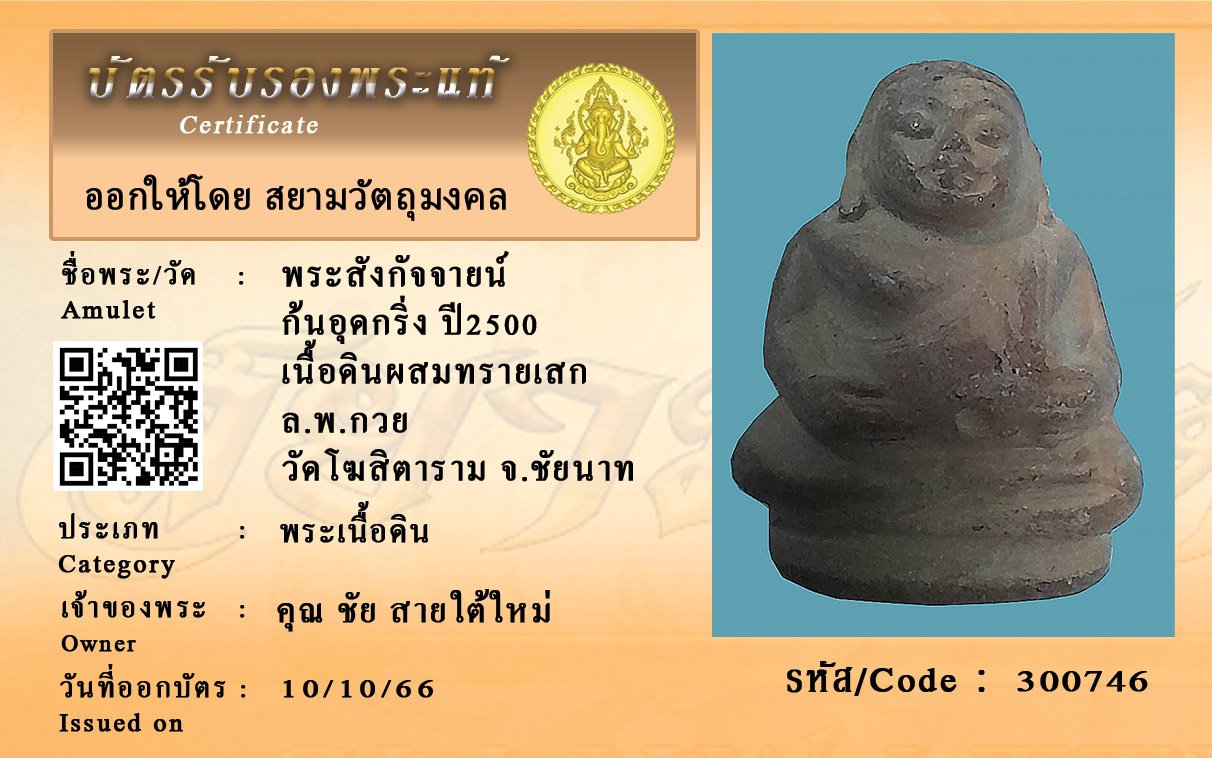 รหัสสินค้า : 300746 พระสังกัจจายน์ ก้นอุดกริ่ง ปี2500 เนื้อดินผสมทรายเสก ล.พ.กวย วัดโฆสิตาราม จ.ชัยนาท