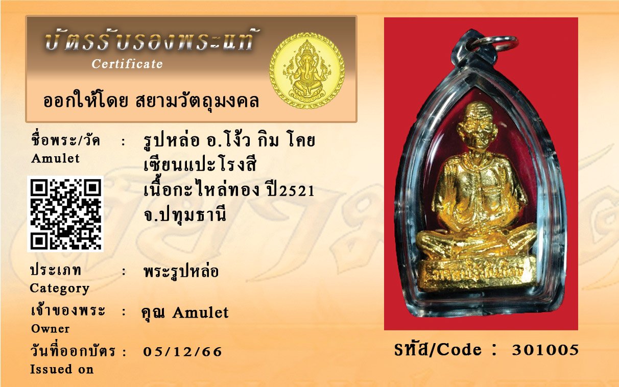 รหัสสินค้า : 301005 รูปหล่อ อ.โง้ว กิม โคย เซียนแปะโรงสี เนื้อกะไหล่ทอง ปี2521 จ.ปทุมธานี