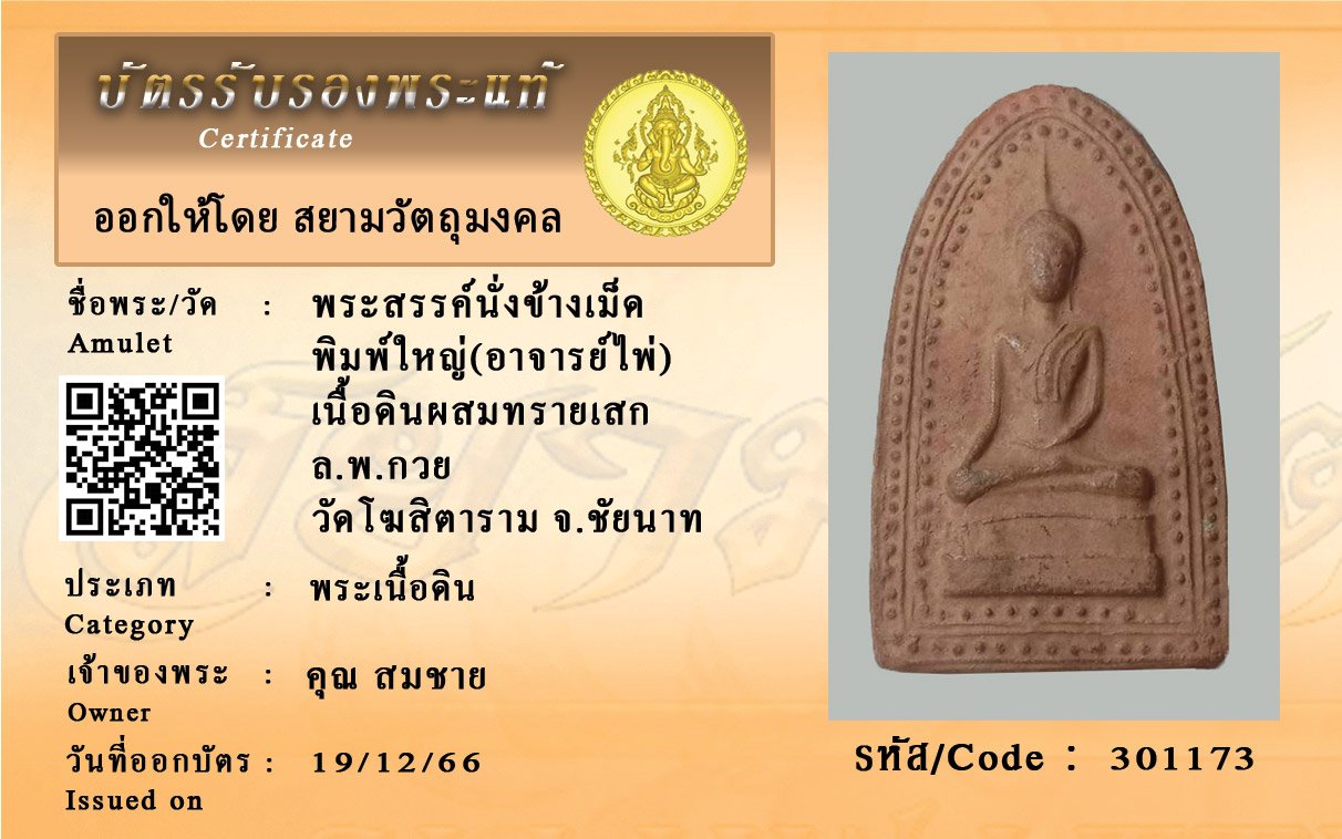 รหัสสินค้า : 301173 พระสรรค์นั่งข้างเม็ด พิมพ์ใหญ่(อาจารย์ไพ่) เนื้อดินผสมทรายเสก ล.พ.กวย วัดโฆสิตาราม จ.ชัยนาท