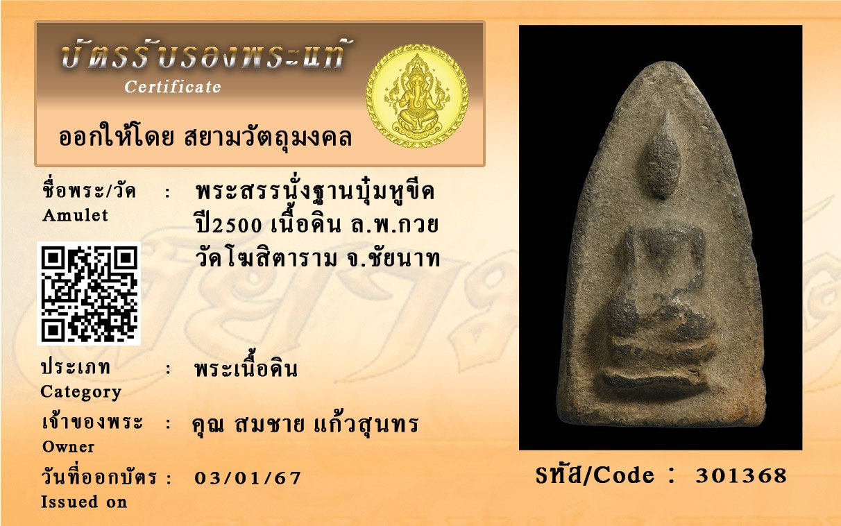 รหัสสินค้า : 301368 พระสรรนั่งฐานบุ๋มหูขีด ปี2500 เนื้อดิน ล.พ.กวย วัดโฆสิตาราม จ.ชัยนาท