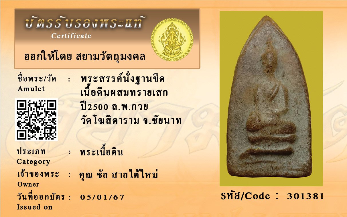 รหัสสินค้า : 301381 พระสรรค์นั่งฐานขีด เนื้อดินผสมทรายเสก ปี2500 ล.พ.กวย วัดโฆสิตาราม จ.ชัยนาท