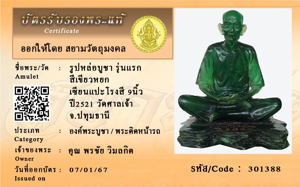 รหัสสินค้า : 301388 รูปหล่อบูชา รุ่นแรก สีเขียวหยก เซียนแปะโรงสี 9นิ้ว ปี2521 วัดศาลเจ้า จ.ปทุมธานี