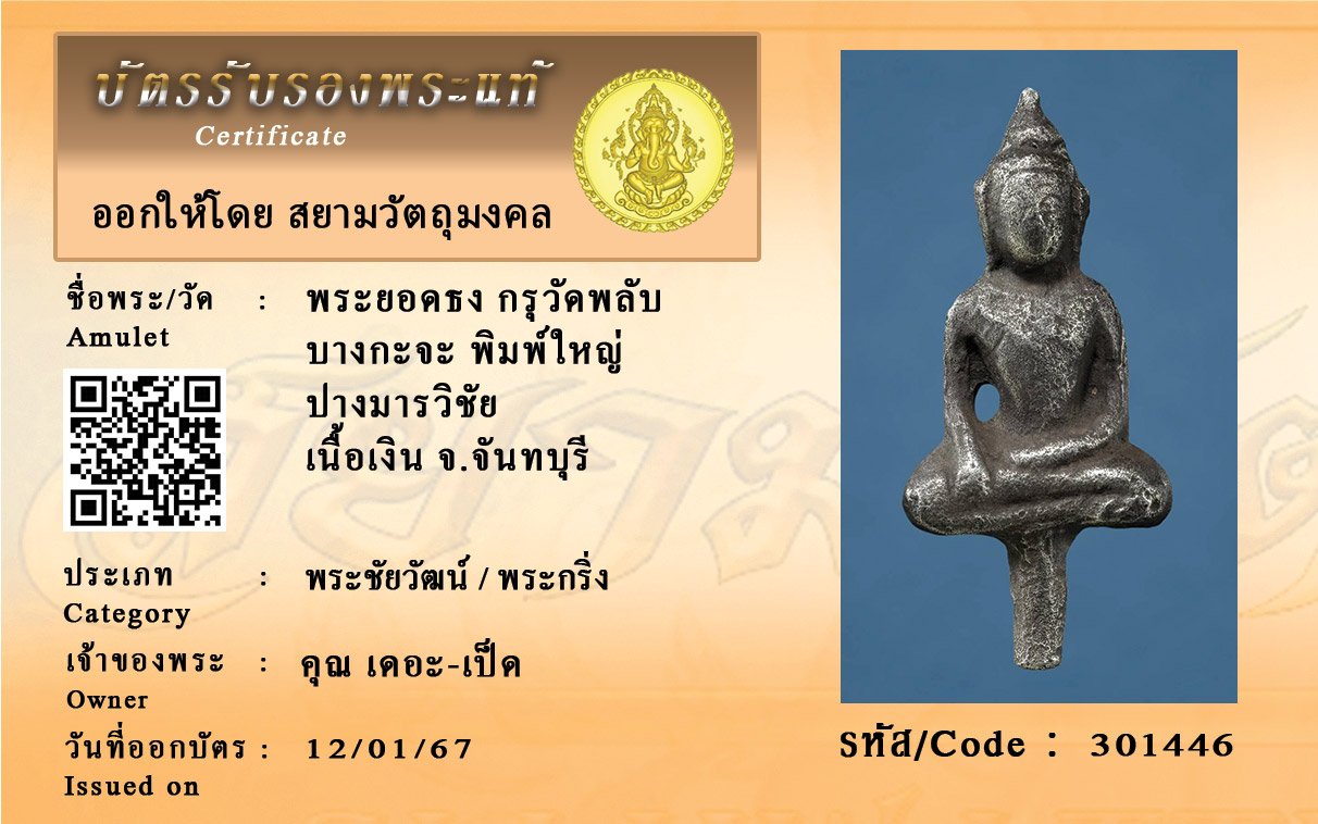 รหัสสินค้า : 301446 พระยอดธง กรุวัดพลับ บางกะจะ พิมพ์ใหญ่ ปางมารวิชัย เนื้อเงิน จ.จันทบุรี