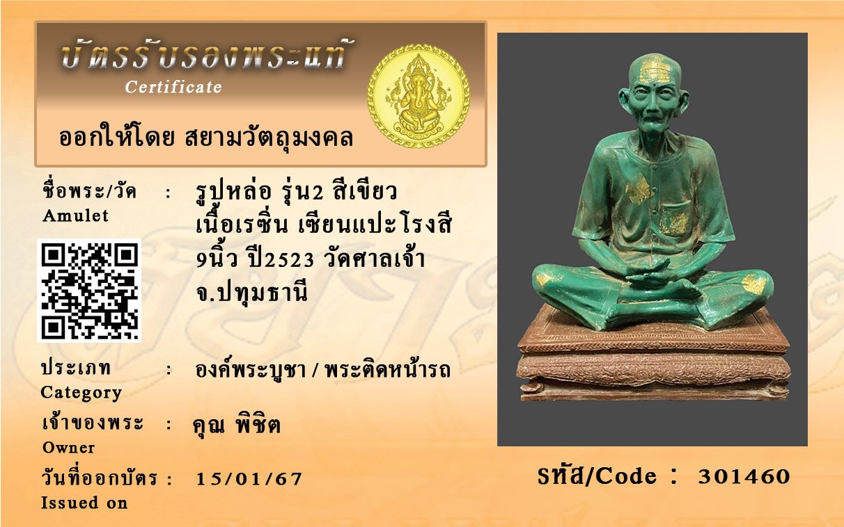 รหัสสินค้า : 301460 รูปหล่อ รุ่น2 สีเขียว เนื้อเรซิ่น เซียนแปะโรงสี 9นิ้ว ปี2523 วัดศาลเจ้า จ.ปทุมธานี