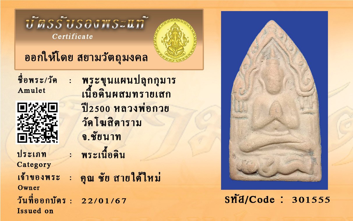 รหัสสินค้า : 301555 พระขุนแผนปลุกกุมาร เนื้อดินผสมทรายเสก ปี2500 หลวงพ่อกวย วัดโฆสิตาราม จ.ชัยนาท
