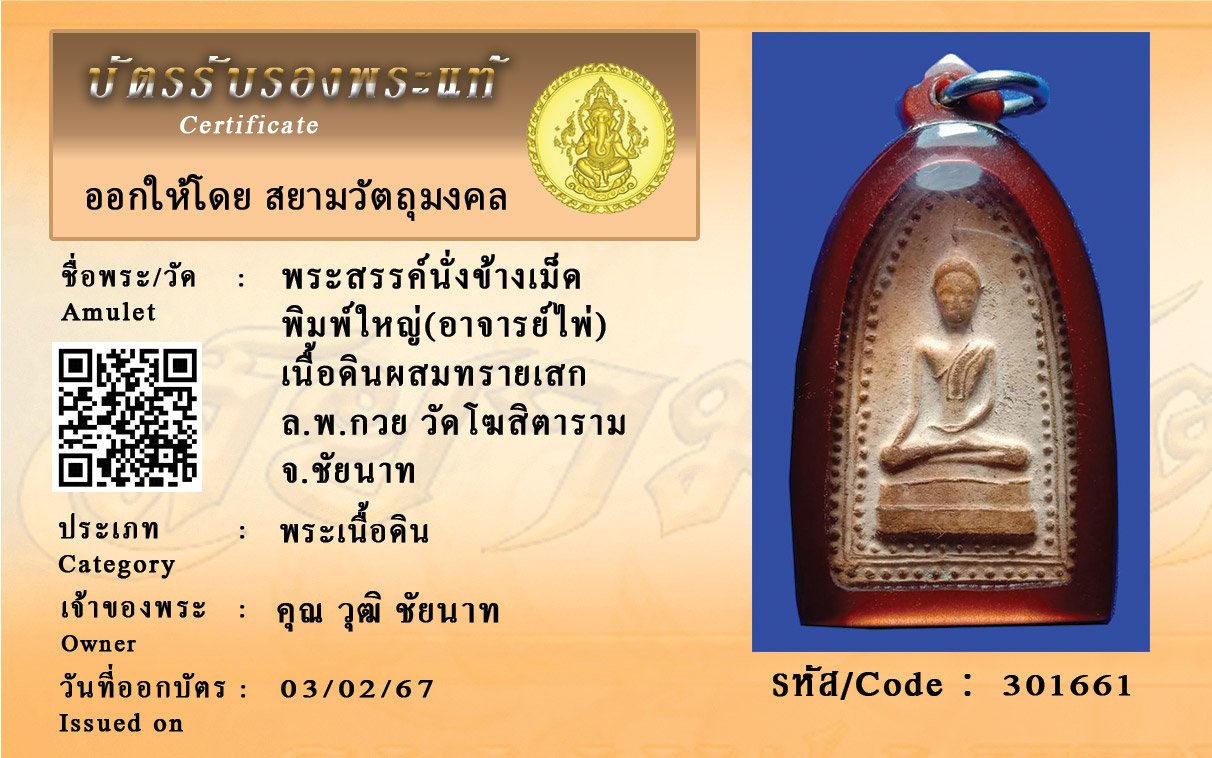 รหัสสินค้า : 301661 พระสรรค์นั่งข้างเม็ด พิมพ์ใหญ่(อาจารย์ไพ่) เนื้อดินผสมทรายเสก ล.พ.กวย วัดโฆสิตาราม จ.ชัยนาท