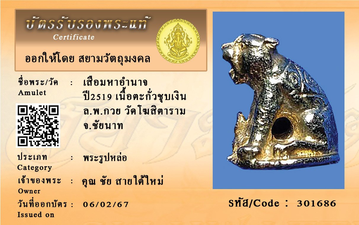 รหัสสินค้า : 301686 เสือมหาอำนาจ ปี2519 เนื้อตะกั่วชุบเงิน ล.พ.กวย วัดโฆสิตาราม จ.ชัยนาท