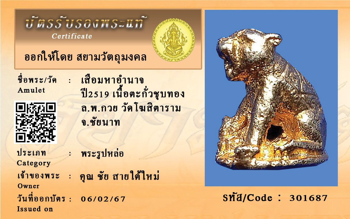 รหัสสินค้า : 301687 เสือมหาอำนาจ ปี2519 เนื้อตะกั่วชุบทอง ล.พ.กวย วัดโฆสิตาราม จ.ชัยนาท
