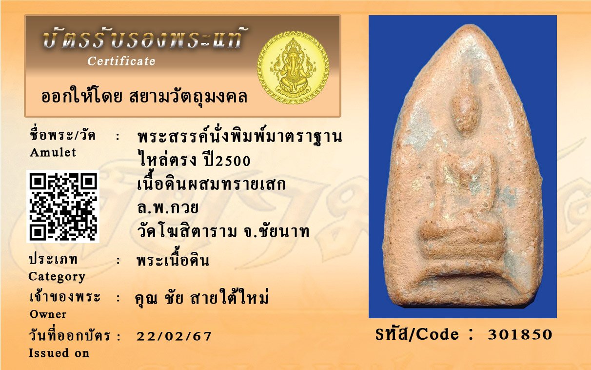 รหัสสินค้า : 301850 พระสรรค์นั่งพิมพ์มาตราฐาน ไหล่ตรง ปี2500 เนื้อดินผสมทรายเสก ล.พ.กวย วัดโฆสิตาราม จ.ชัยนาท