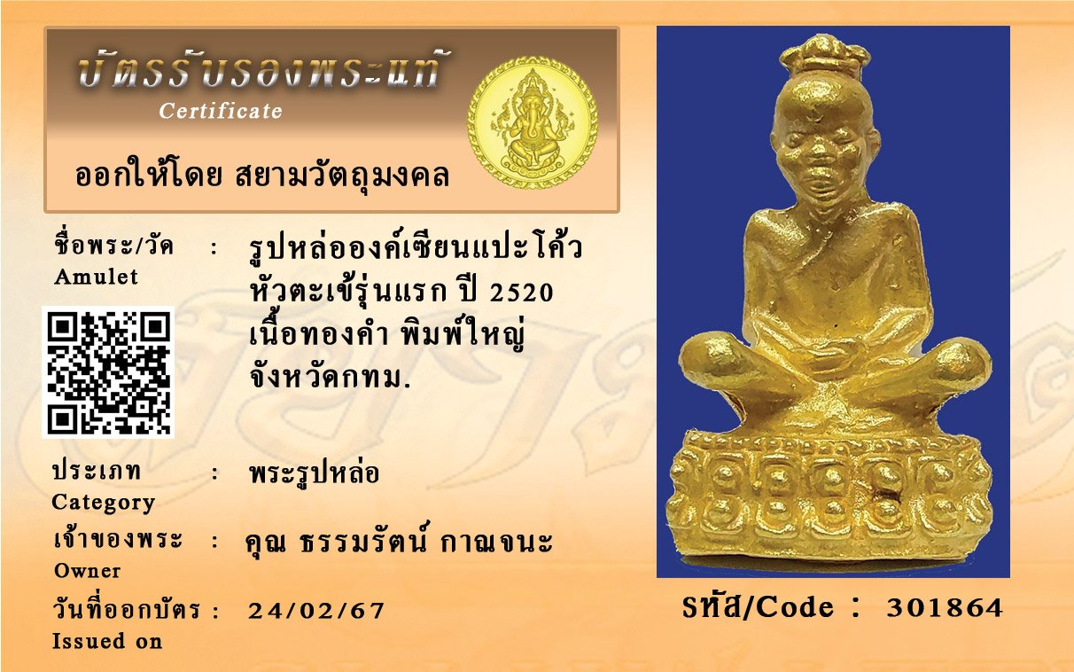 รหัสสินค้า : 301864 รูปหล่อองค์เซียนแปะโค้ว หัวตะเข้รุ่นแรก ปี 2520 เนื้อทองคำ พิมพ์ใหญ่ จังหวัดกทม.