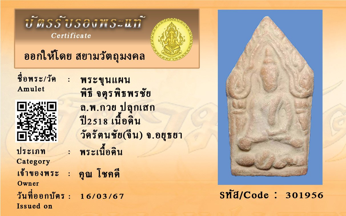 รหัสสินค้า : 301956 พระขุนแผน พิธี จตุรพิธพรชัย ล.พ.กวย ปลุกเสก ปี2518 เนื้อดิน วัดรัตนชัย(จีน) จ.อยุธยา