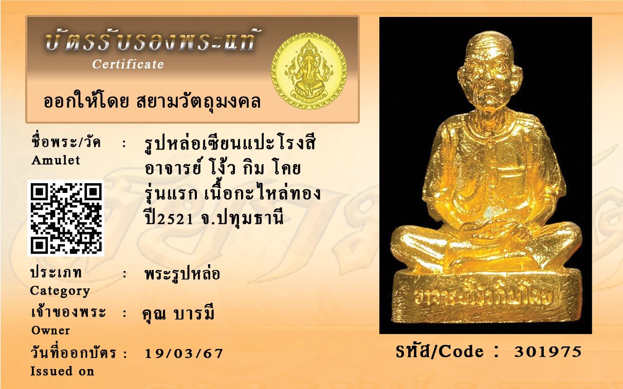 รหัสสินค้า : 301975 รูปหล่อเซียนแปะโรงสี อาจารย์ โง้ว กิม โคย รุ่นแรก เนื้อกะไหล่ทอง ปี2521 จ.ปทุมธานี