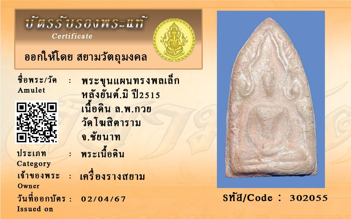รหัสสินค้า : 302055 พระขุนแผนทรงพลเล็ก หลังยันต์.มิ ปี2515 เนื้อดิน ล.พ.กวย วัดโฆสิตาราม จ.ชัยนาท