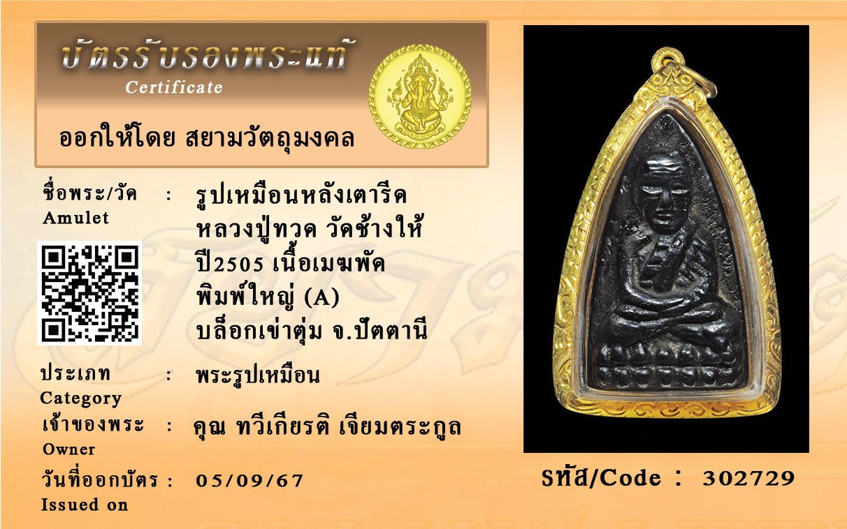 รหัสสินค้า : 302729 รูปเหมือนหลังเตารีด หลวงปู่ทวด วัดช้างให้ ปี2505 เนื้อเมฆพัด พิมพ์ใหญ่(A) บล็อกเข่าตุ่ม จ.ปัตตานี