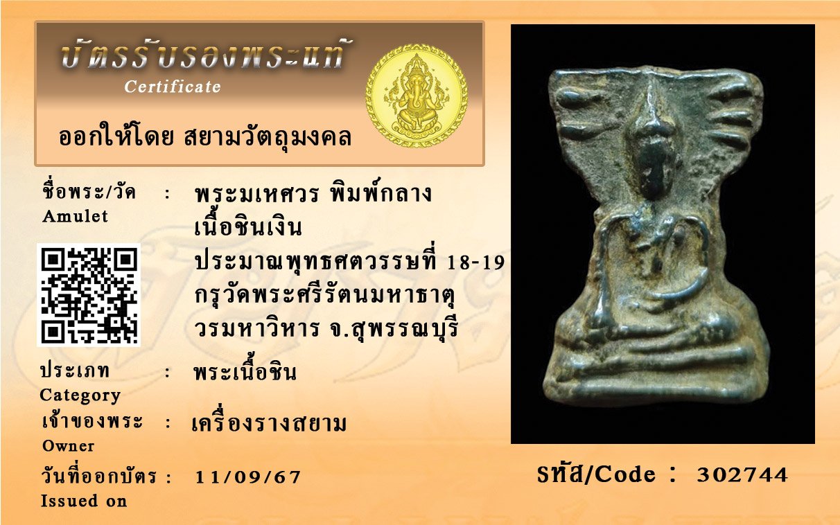 รหัสสินค้า : 302744 พระมเหศวร พิมพ์กลาง เนื้อชินเงิน ประมาณพุทธศตวรรษที่ 18-19 กรุวัดพระศรีรัตนมหาธาตุ วรมหาวิหาร จ.สุพรรณบุรี