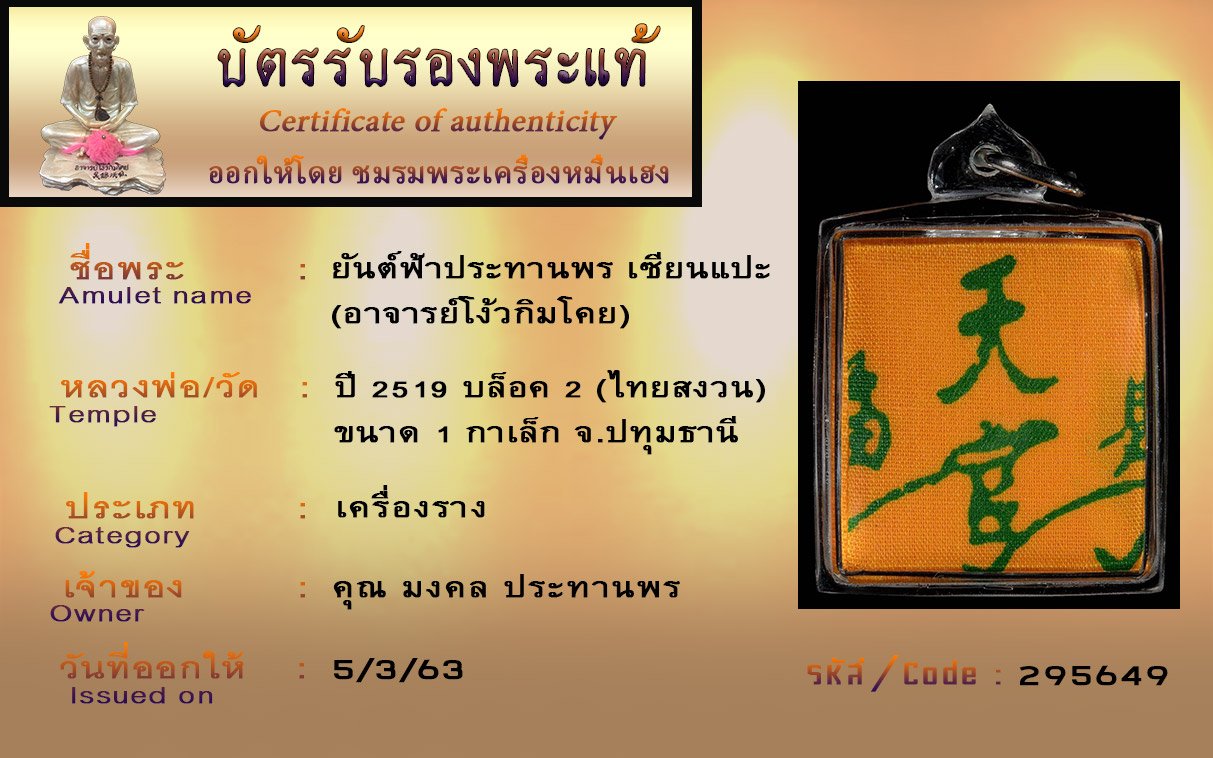 รหัสสินค้า : (295649) ยันต์ฟ้าประทานพร เซียนแปะ (อาจารย์โง้วกิมโคย) ปี2519 บล็อค2 (ไทยสงวน) ขนาด1กาเล็ก จ.ปทุมธานี