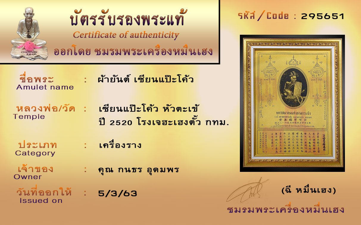 รหัสสินค้า : (295651) ผ้ายันต์เซียนแป๊ะโค้ว หัวตะเข้ ปี2520 โรงเจ ฮะเฮงตั้ว กทม.