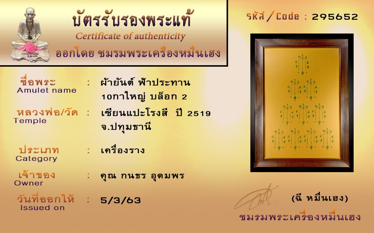 รหัสสินค้า : (295652) ผ้ายันต์ฟ้าประทาน 10กาใหญ่ บล็อก2 ปี2519 เซียนแปะโรงสี จ.ปทุมธานี