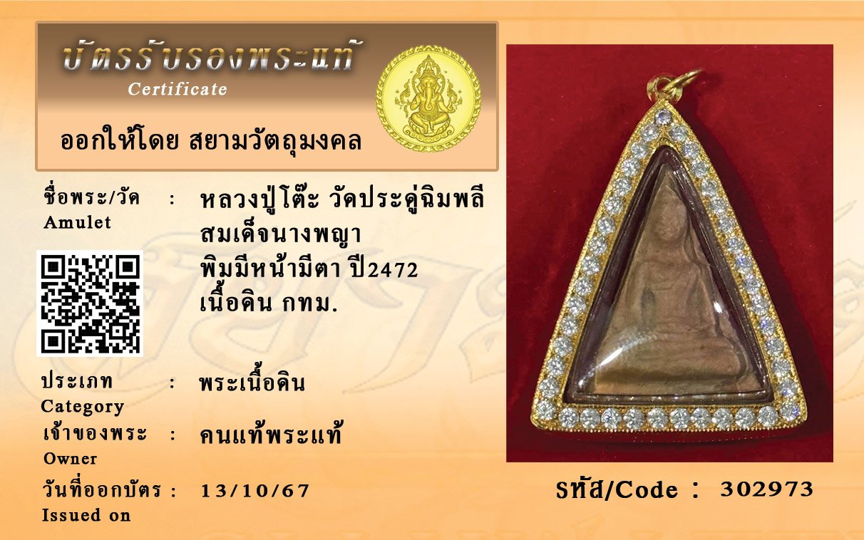 รหัสสินค้า : 302973 หลวงปู่โต๊ะ วัดประดู่ฉิมพลี สมเด็จนางพญา พิมมีหน้ามีตา ปี2472 เนื้อดิน