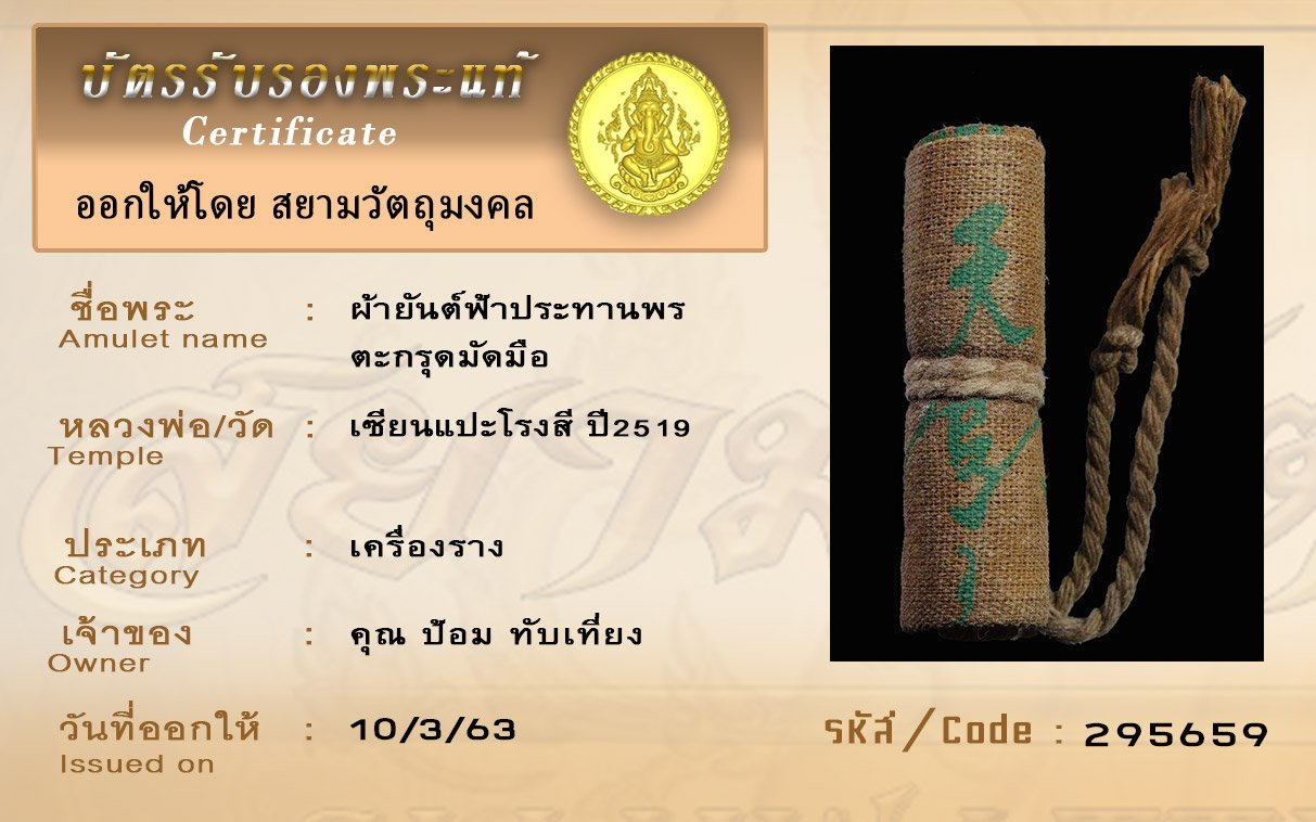 รหัสสินค้า : (295659) ผ้ายันต์ฟ้าประทานพร ตระกรุดมัดมือ เซียนแปะโรงสี ปี2519
