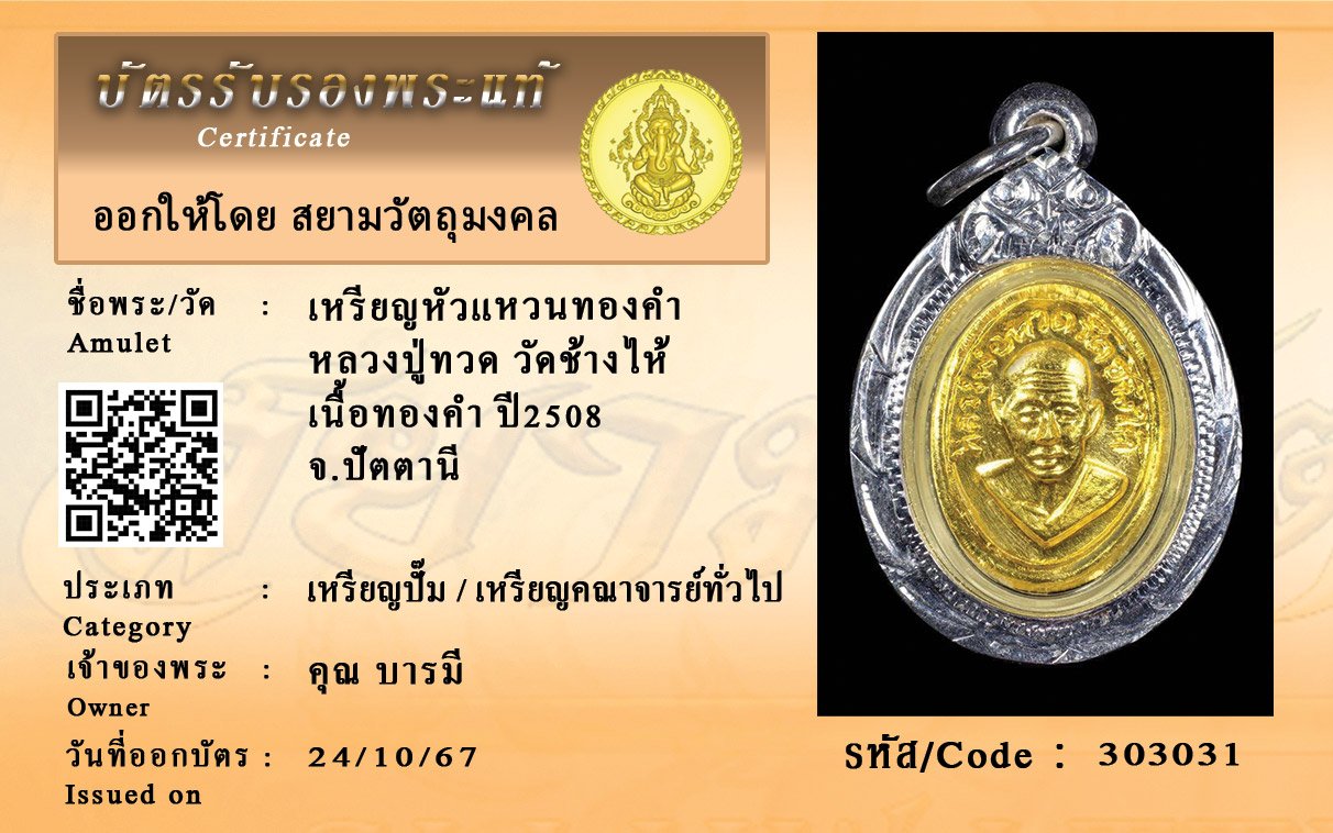 รหัสสินค้า : 303031 เหรียญหัวแหวนทองคำ หลวงปู่ทวด วัดช้างไห้ เนื้อทองคำ ปี2508 จ.ปัตตานี