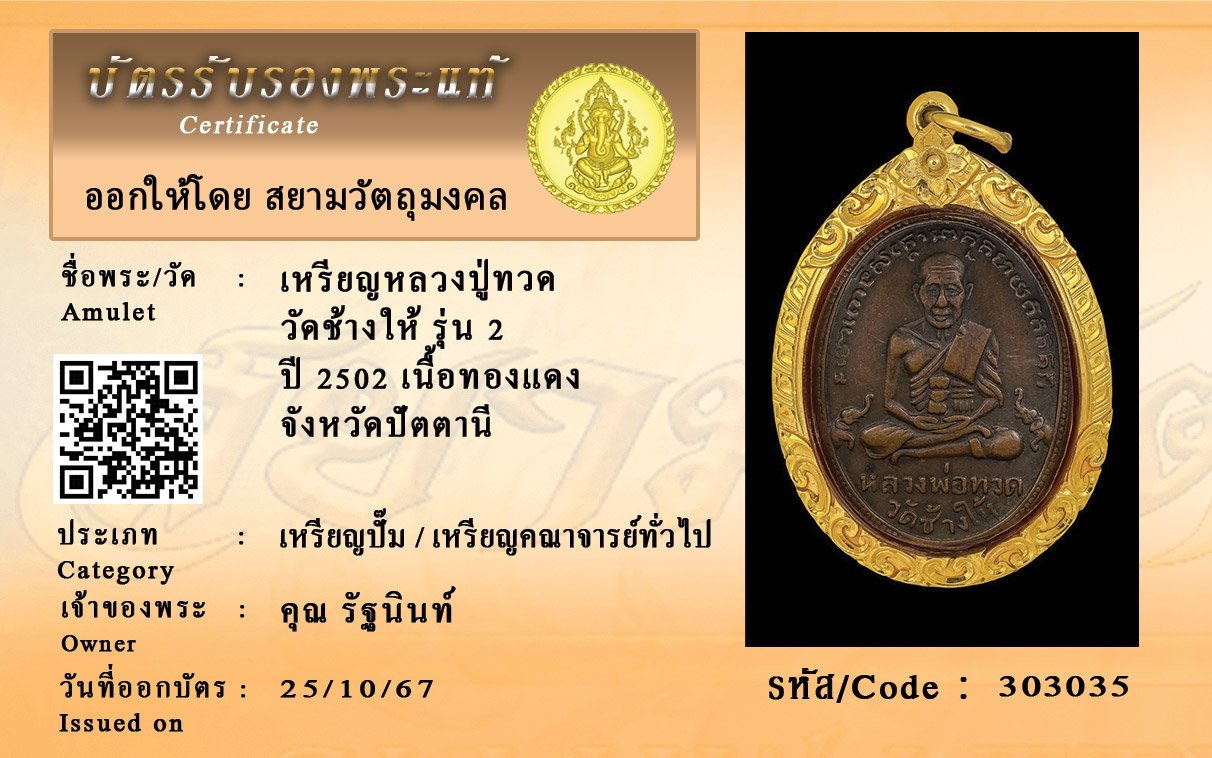 รหัสสินค้า : 303035 เหรียญหลวงปู่ทวด วัดช้างให้ รุ่น 2 ปี 2502 เนื้อทองแดง จังหวัดปัตตานี